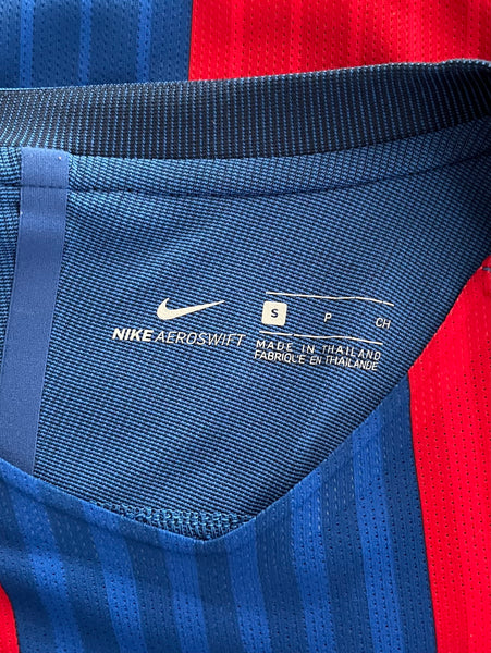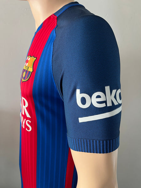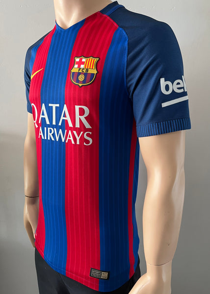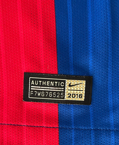 Notes: Iconic Messi celebration Bernabeu. (Camiseta o jersey versión jugador, número y parche de la liga igual versión jugador. Fue reparada, tenía un dorsal pirata, prácticamente no tiene marcas de la reparación. Modelo legendario con el que Messi festejó en el Bernabeu mostrando su camiseta)