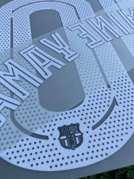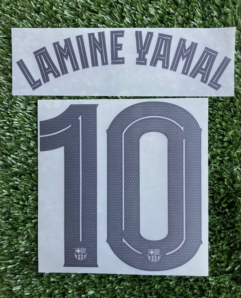 Número y nombre de Lamine Yamal con el 10 para las camisetas de visitante (colección Kobe Bryant) para la temporada 2025-2026. Versión jugador esta tipografía es del club y se usa para Champions League, Copa, Supercopa y amistosos.
