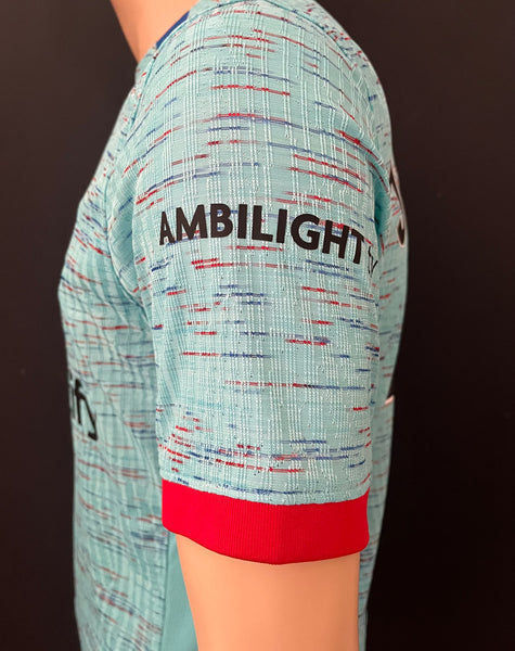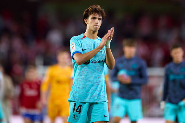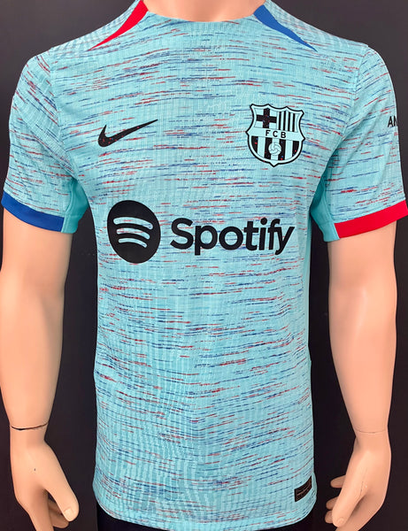 Tercera equipación del FC Barcelona para la temporada 2023-2024. Con nombre y número de Joao Felix, marca Textprint. Tiene parches de La Liga incluyendo el de campeón. Es versión jugador.
